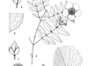 Shrub 1.5-2 m tall, spreading to 2.5 m wide, with branches arching to spreading. Stem yellow-brown, 4-angled but not ancipitous when young, soon terete; internodes 10-50 mm long, shorter than leaves. Leaves petiolate, with petiole 1-2.5 mm long; lamina (20-)25-85 x 10-40 mm, elliptic-oblong to ovate-lanceolate or oblong- lanceolate, apiculate or obtuse to rounded, margin plane, base truncate to rounded, paler beneath, not glaucous, chartaceous; venation: 3-4(5) pairs main laterals, all or only distal ones closed, with subsidiaries rarely prominent and tertiary reticulum not visible; laminar glands dots and short streaks; ventral glands absent or rarely sparse. Inflorescence l-3(-5)-flowered from apical node; pedicels 2-10 mm long; bracts reduced, lanceolate, persistent. Flowers (30-)50-65 mm in diam., shallowly cyathiform; buds ovoid, obtuse. Sepals 7-10 x 4.5-6.2 mm, free, imbricate, subqual, erect in bud and fruit, ovate to oblong-ovate or oblong-spathulate, acute or apiculate to obtuse or rounded-apiculate, margin entire or minutely denticulate, sometimes narrowly hyaline; midrib distinct, veins becoming prominent after flowering; laminar glands linear or interrupted, numerous. Petals golden yellow, shallowly incurved, (20-)25-32 x (12-)15-32 mm, 3-4 x sepals, broadly obovate to subcircular, with apiculus lateral rounded; margin entire. Stamen fascicles each with 40-45 stamens, longest 12-15 mm long, c. 0-4 x petals; anthers yellow. Ovary 5-7 x 3-5 mm, ovoid; styles 4.5-5(-7) mm, 0.7-0.8(-l) x ovary, free, suberect, outcurving near apex; stigmas scarcely capitate. Capsule c. 20 x 10-12 mm, ovoid to cylindric- ovoid. Seeds dark reddish-brown, 1-1.2 mm long, cylindric, not or scarcely carinate, shallowly linear- reticulate.